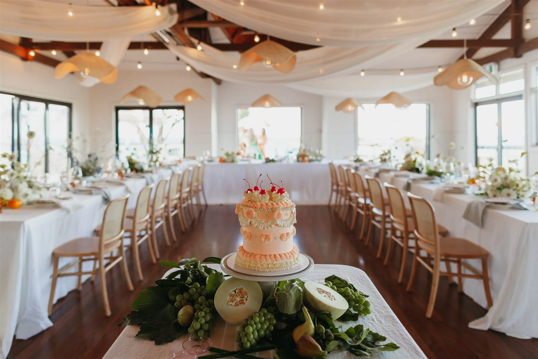 Of course, the final elements to bring the reception together are the unique and gentle wave pendants combined with the festoon lights and soft, romantic draping that all sit gracefully overhead. And don’t forget that fantastic, retro cake!!