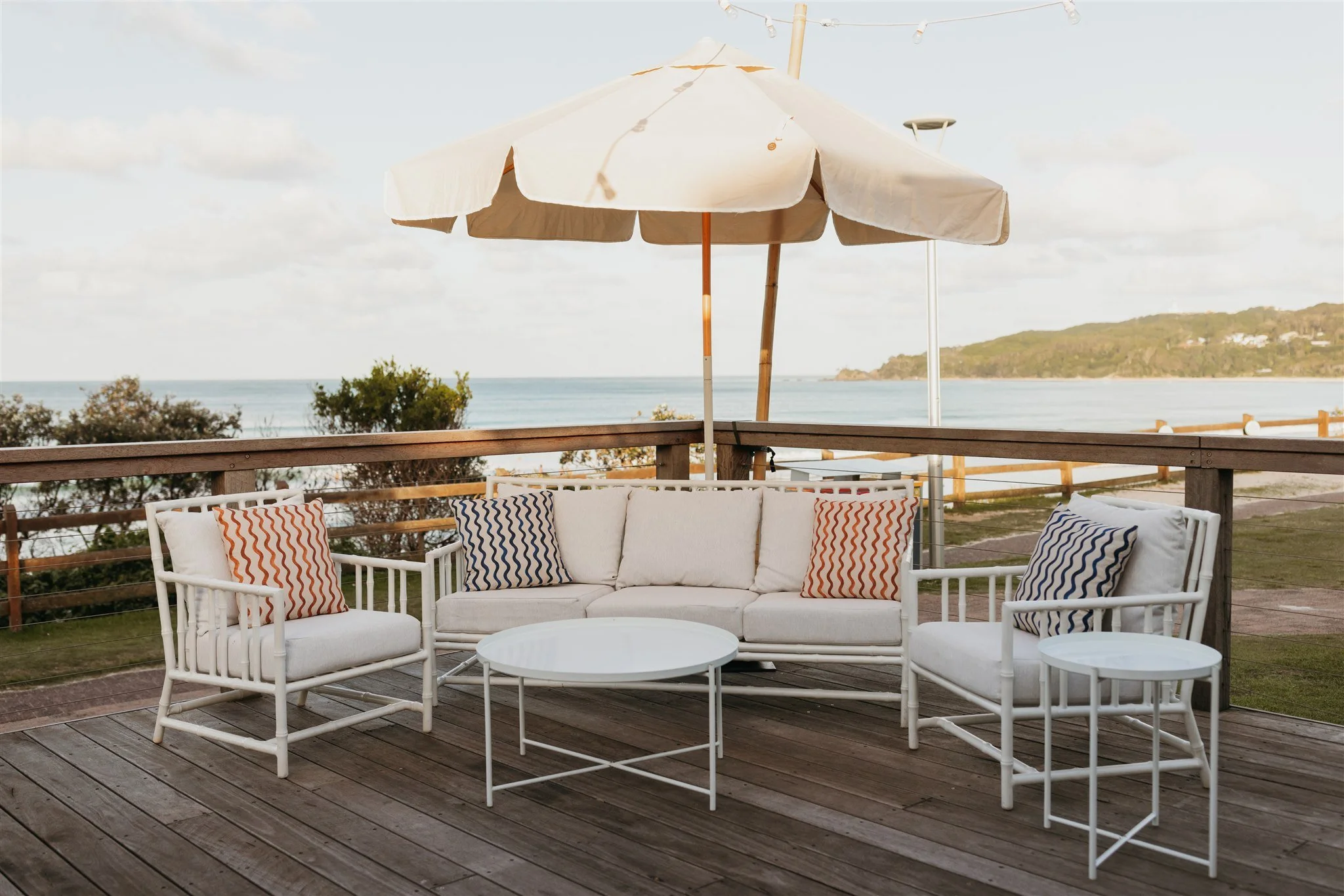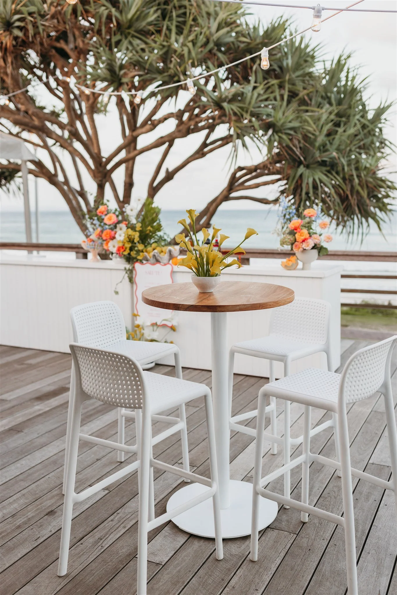 Cocktail hour is one of the best parts of the day where guests can relax, sip cocktails and catch up with their favourite people while relaxing into the flow of the afternoon! High bars & stools mixed with resort-style lounges help to create that relaxed seaside holiday feel. A few bold umbrellas and cushions add the finishing touches whilst also adding that practical, much needed shade and comfort for your guests.