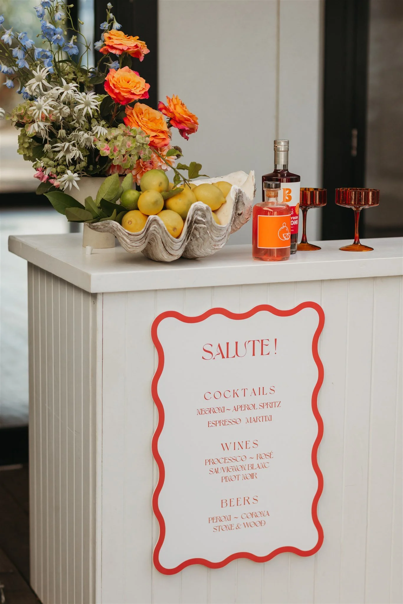 To continue the Italian coastal feel into your reception, the tables are styled with flowing linen tablecloths, a combination of fruits, florals, candles and shells that keep the feeling relaxed, yet carefully detailed. Stand-out elements such as the modern gold cutlery, amber glassware, marine stripe linen napkins and ruby red wave menus add a touch of excitement and sophistication to the tables.