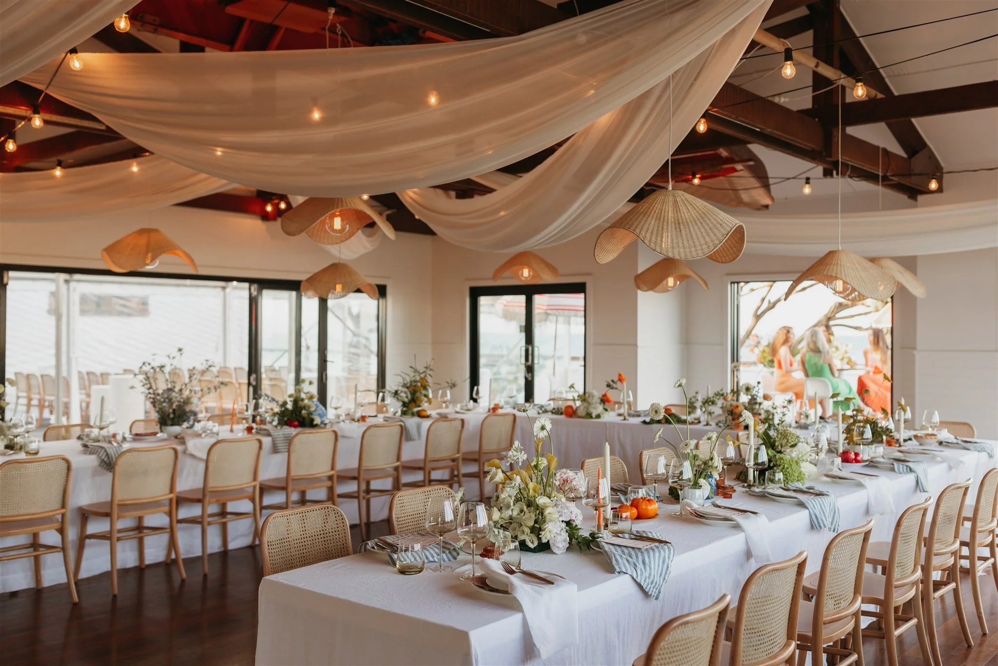This ceremony feel is sophisticated yet simple, complementing the natural beauty of the coastal back drop. Flowing white linen draping softens and frames this stunning backdrop, accented with a cluster of white woven pendants to create a perfectly defined focal point for the ceremony.