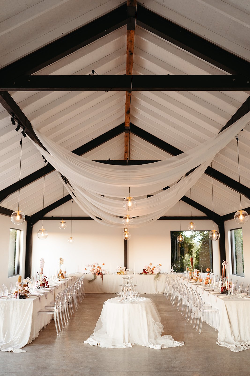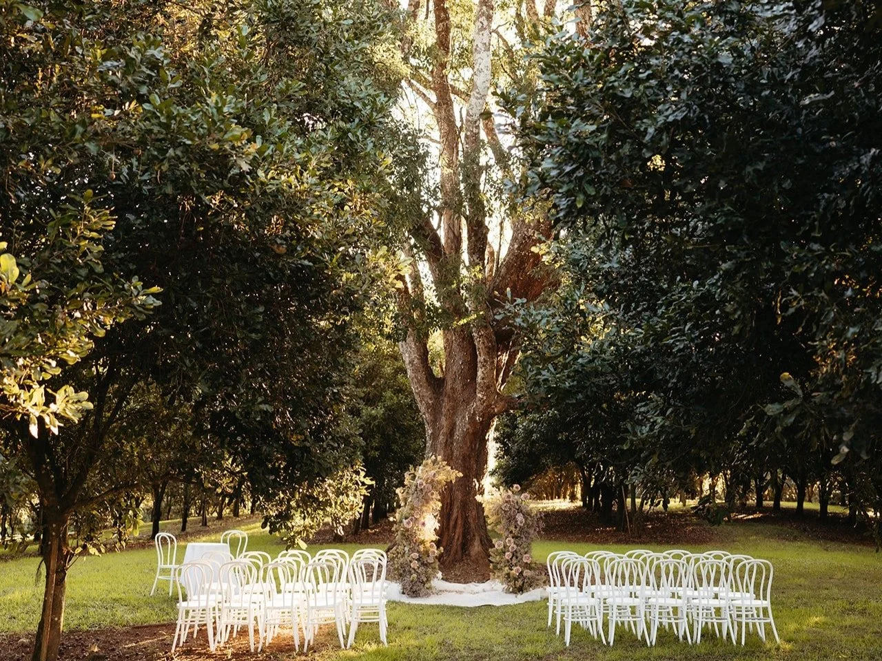 Begin your magical journey by exchanging vows in an exquisite outdoor space like this incredible ceremony location amidst a Macadamia orchard. The whimsical and playful feel of this space is enhanced by cascading florals in soft silvery tones and mauve hues, framing the natural surroundings. An incredible floral installation, crafted by Nikau Flora, showcases our broken arch arbour adorned with layers of floating white tulle. The interplay of mottled light and shadows from the trees creates a soft and intimate setting, to gather your guests around and share this special moment.