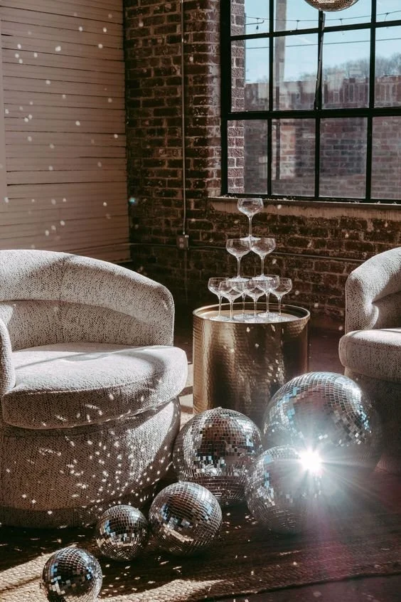For a sleek and modern look, we present white high bar tables and ghost stools, complemented by our black Everett lounge set and Velvet Sable lounge. Velvet cushions accentuate the color scheme, while scallop umbrellas provide shade and comfort for guests. To create a WOW factor, we recommend a statement cocktail bar adorned with shimmering and sparkling elements. Mirror balls, a striking floral display, fun bar signage, and our favourite mini martini glasses will amplify the party vibe.