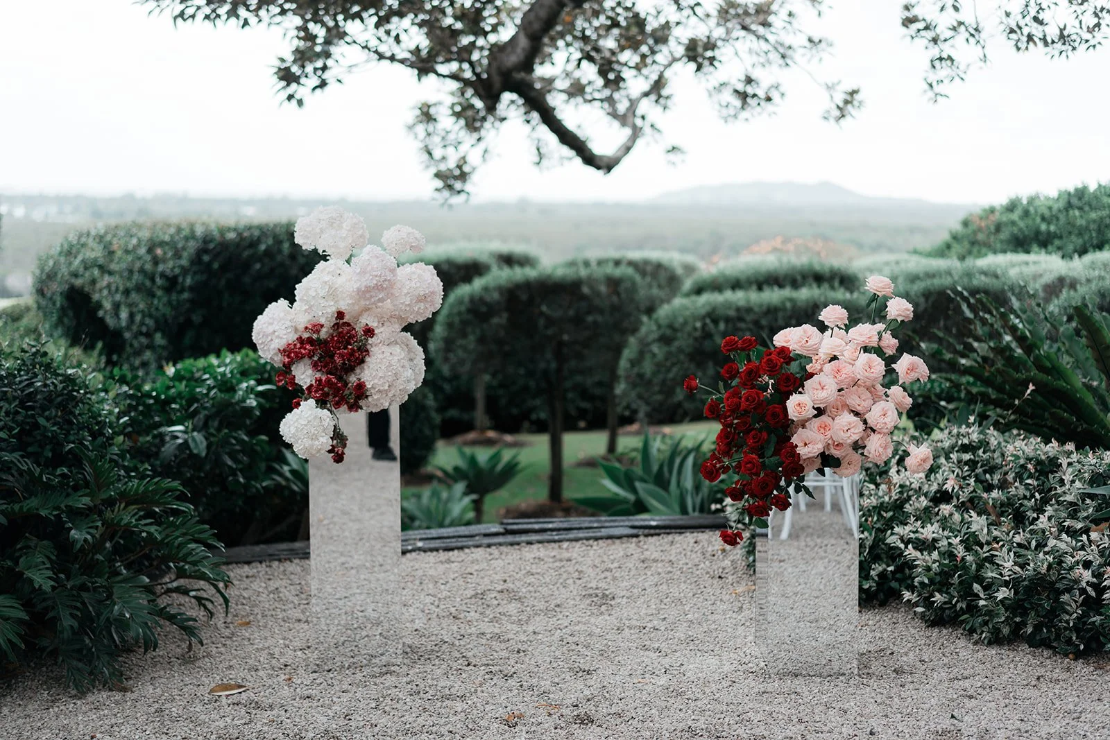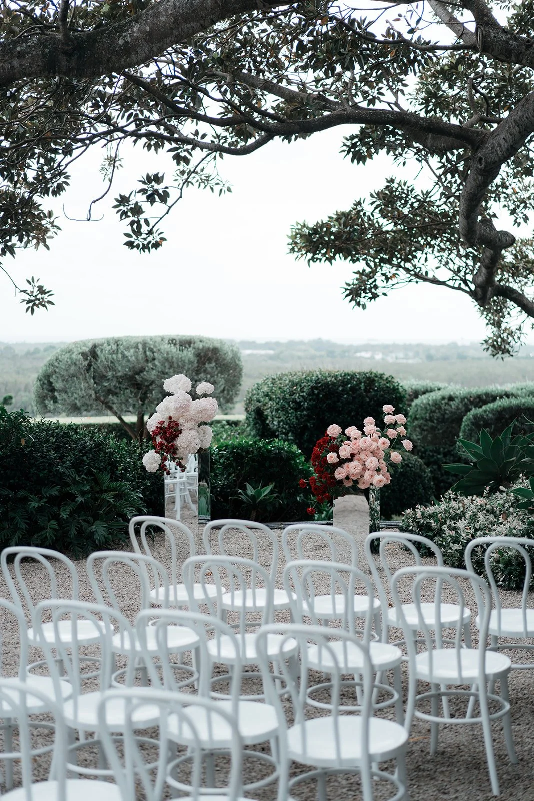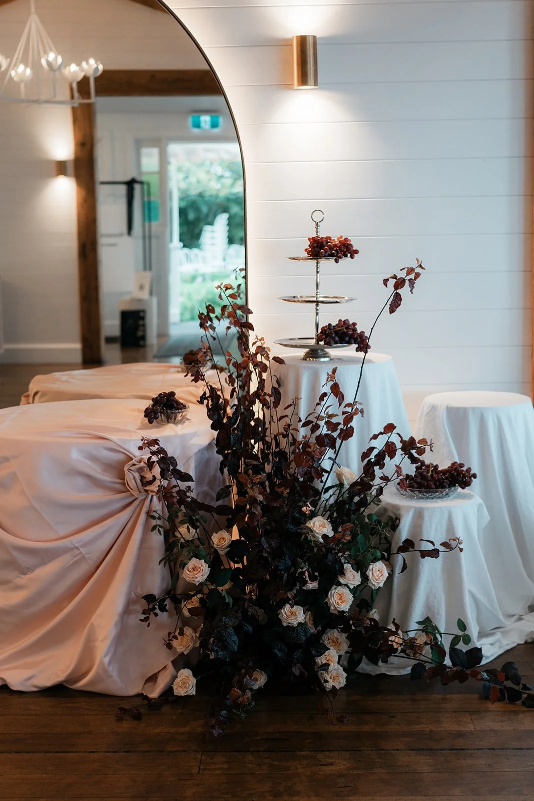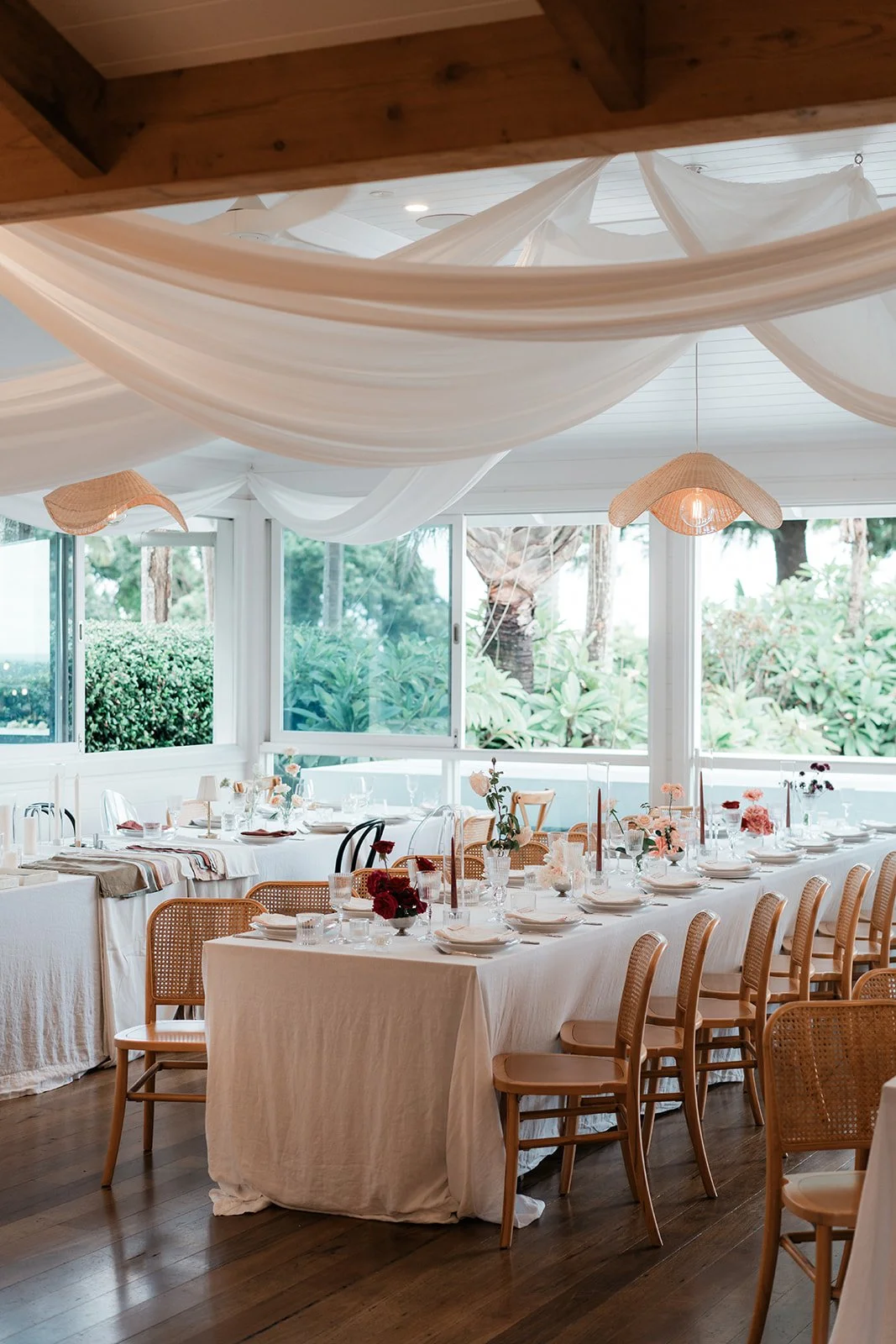 Styling the Summer Venue Open Day we wanted to achieve a look of modern European romance, blending a clean, monochromatic base with rich, seasonal accents. The overall aesthetic centered on elevated organic textures, pairing the structural lines of white bentwood chairs and mirrored ceremony plinths with the softness of billowed ceiling draping and draped linen. This contrast created a space that felt architectural and high-end, yet remained grounded by the lush, garden-inspired surroundings of the Fig Tree.
