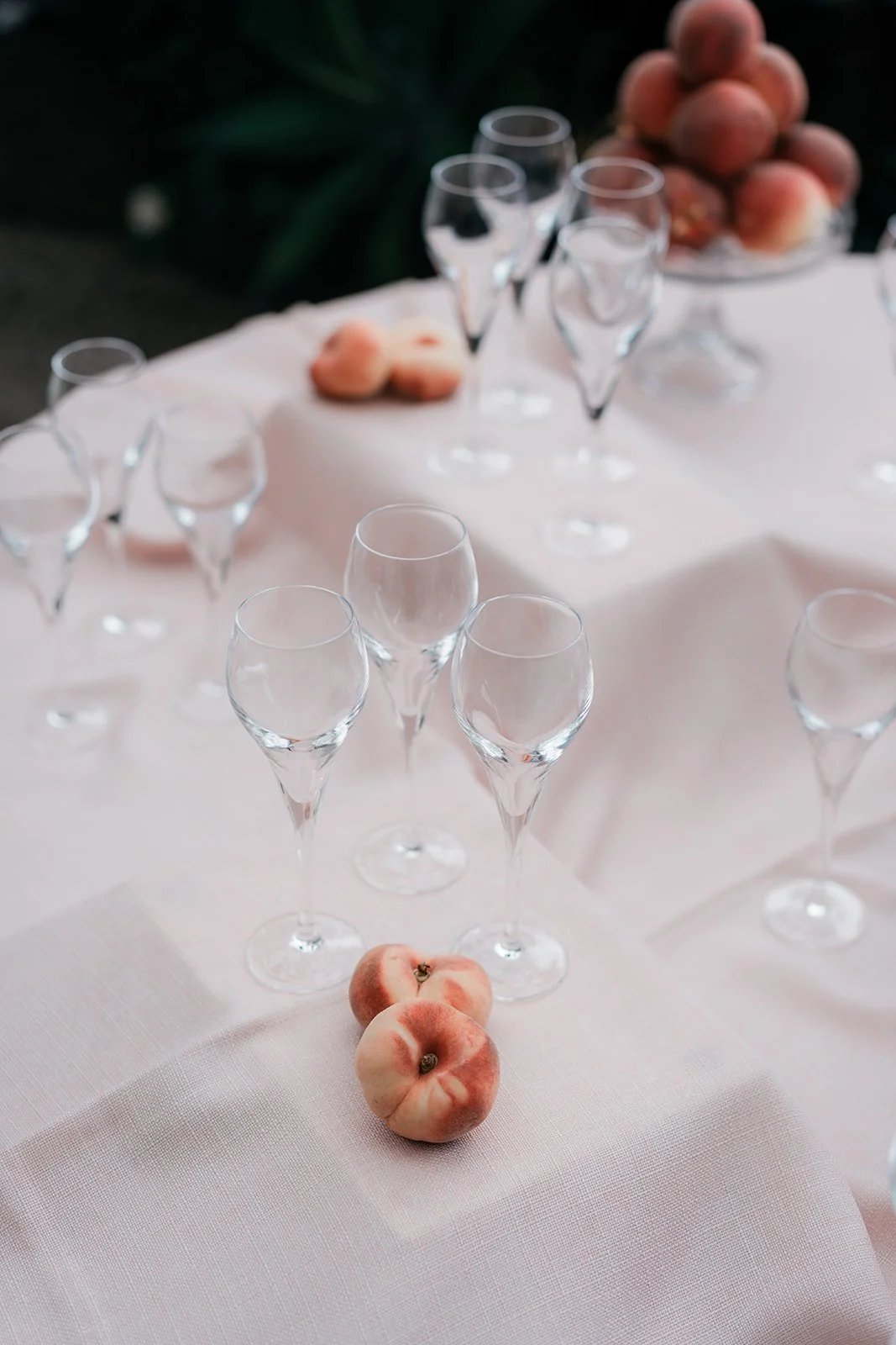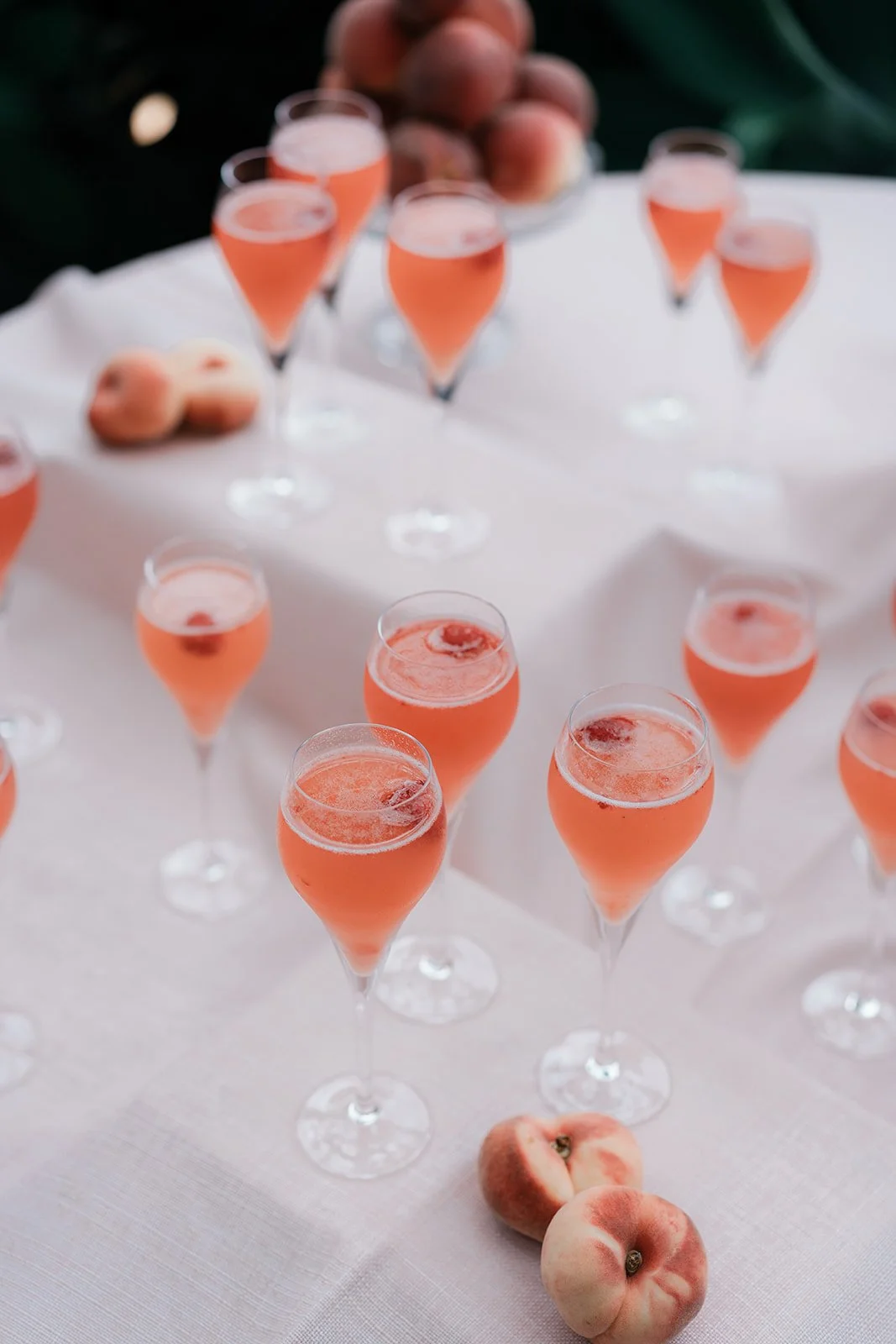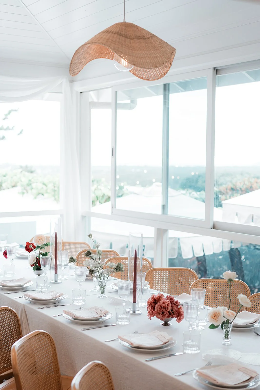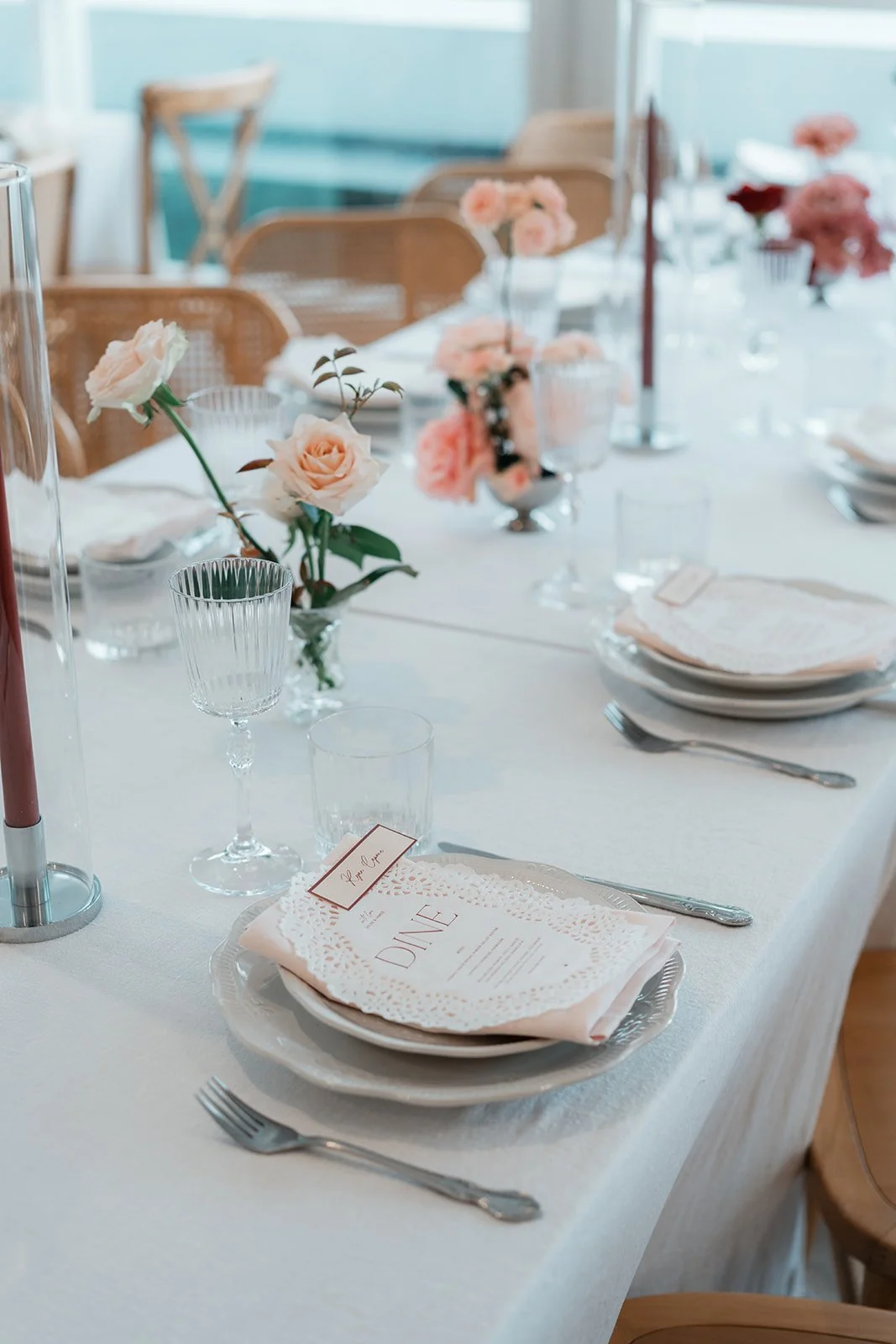 To bring this vision to life, we focused on intentional, tonal details that added depth to the airy venue. Deep burgundy taper candles and clusters of "toffee" and "blush" roses provided a sophisticated color pop against the crisp white tablescapes and ribbed glassware. We moved away from traditional floral vessels, instead using tiered silver fruit stands and crystal bowls filled with red grapes and peaches to create a "living still life" effect. These elements, combined with the warmth of woven rattan pendants and the romantic movement of the fabric-draped ceilings, resulted in a cohesive, multi-sensory experience that felt like a refined Mediterranean retreat.