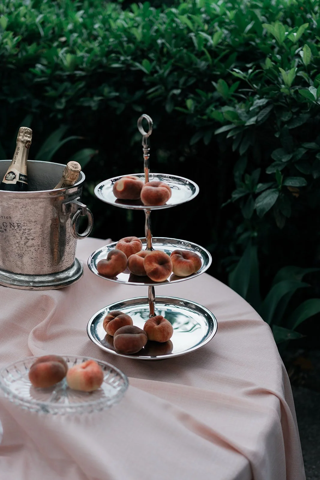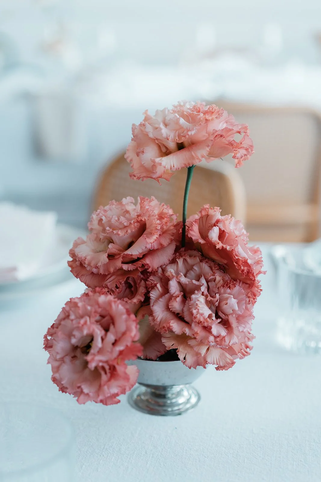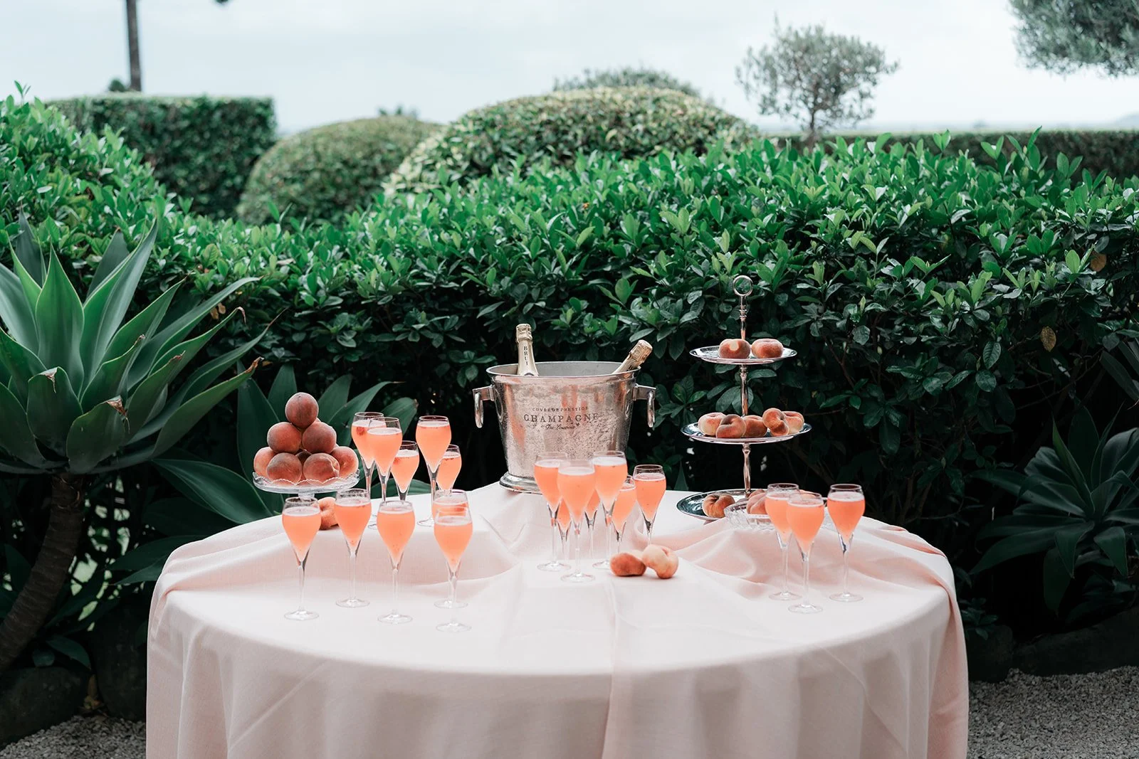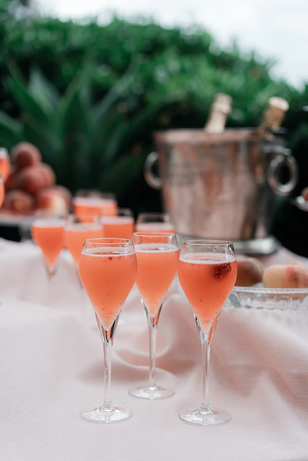 To bring this vision to life, we focused on intentional, tonal details that added depth to the airy venue. Deep burgundy taper candles and clusters of "toffee" and "blush" roses provided a sophisticated color pop against the crisp white tablescapes and ribbed glassware. We moved away from traditional floral vessels, instead using tiered silver fruit stands and crystal bowls filled with red grapes and peaches to create a "living still life" effect. These elements, combined with the warmth of woven rattan pendants and the romantic movement of the fabric-draped ceilings, resulted in a cohesive, multi-sensory experience that felt like a refined Mediterranean retreat.