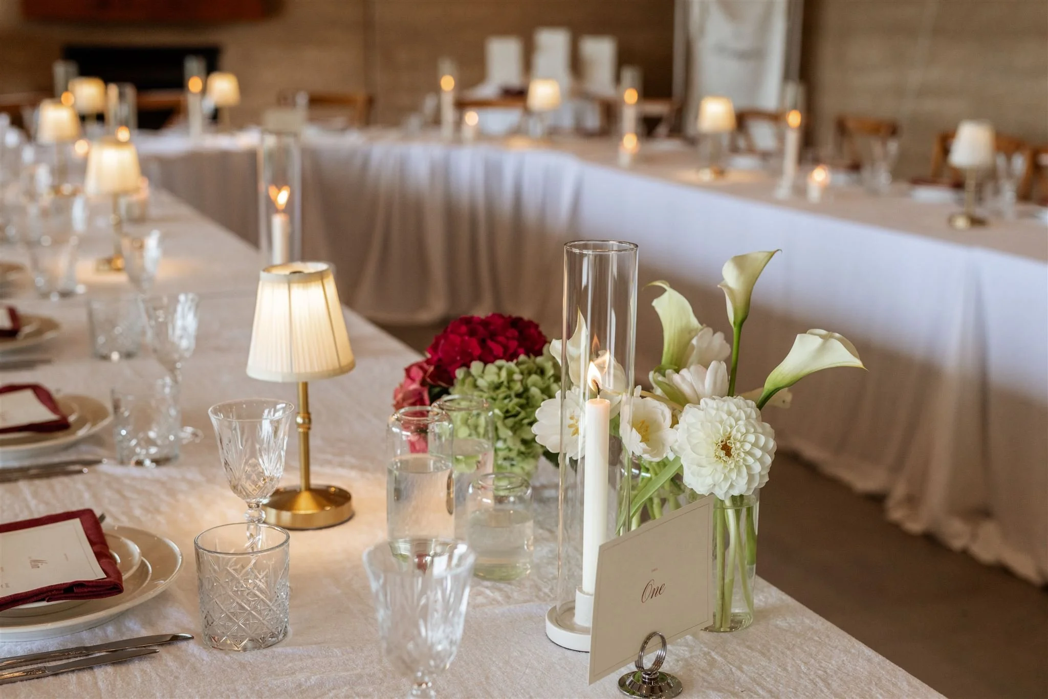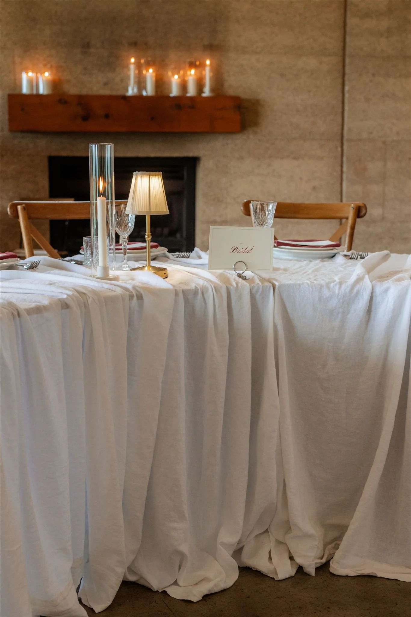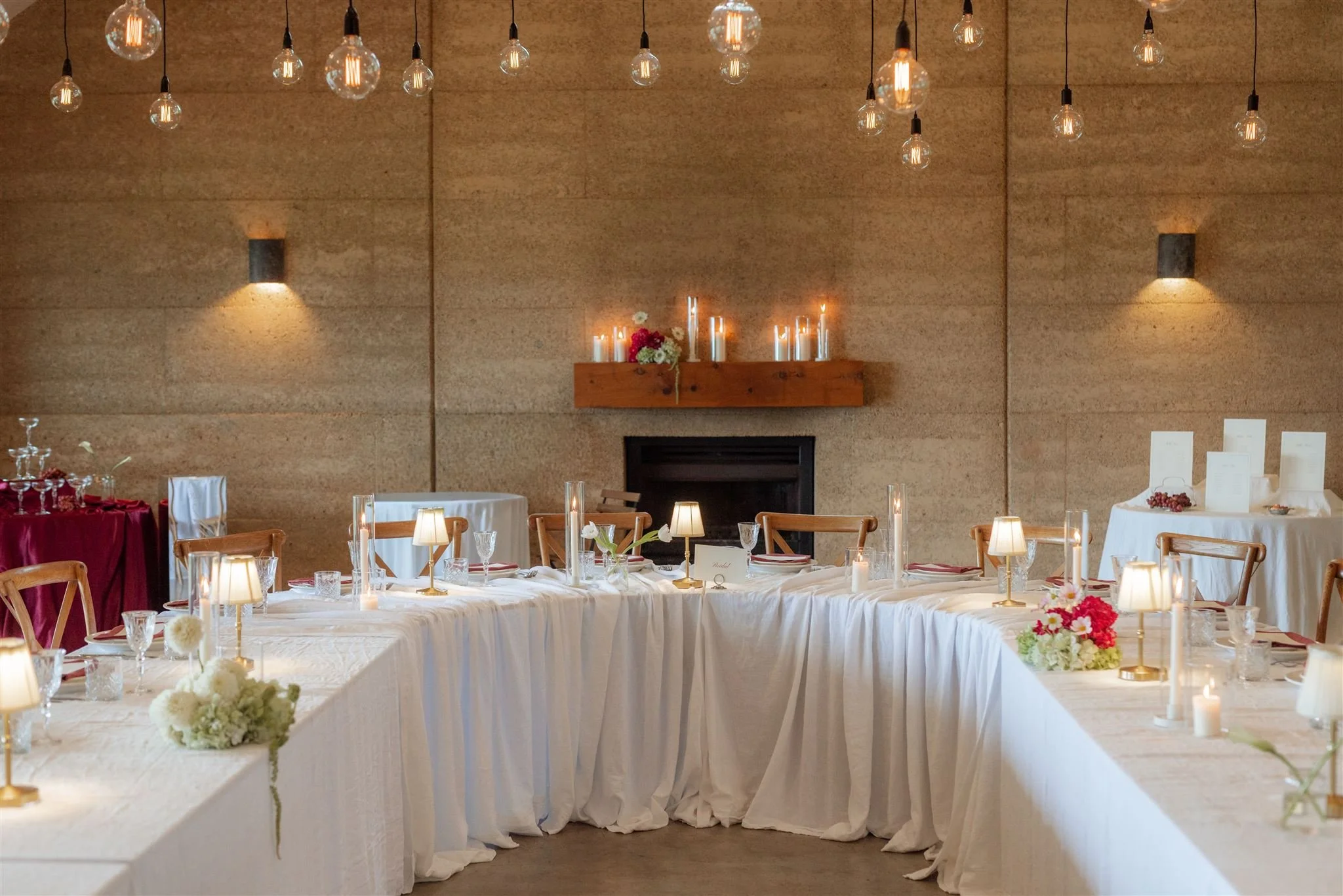 Our Valentine’s Day shoot at The Earth House reimagined classic romance through a lens of curated, monochromatic elegance, grounding soft cottagecore sensibilities with bold, modern accents. Against the venue's iconic rammed-earth backdrop, we layered crisp white linens and ethereal cream draping with striking pops of deep merlot and burgundy, creating a high-contrast aesthetic that feels both timeless and editorial. From the soft glow of pleated brass lamps and tall hurricane candles to the decadent, "still life" styling of the champagne tower, we love this look!