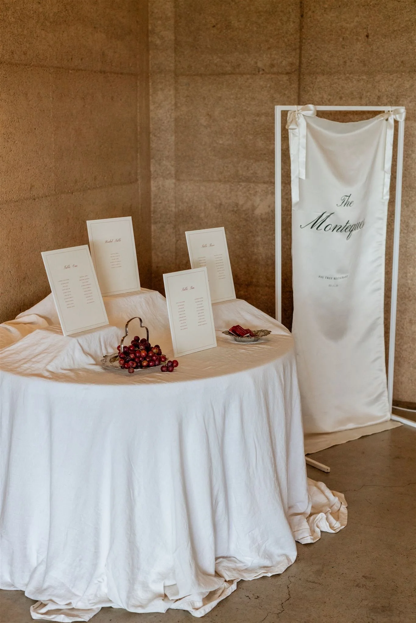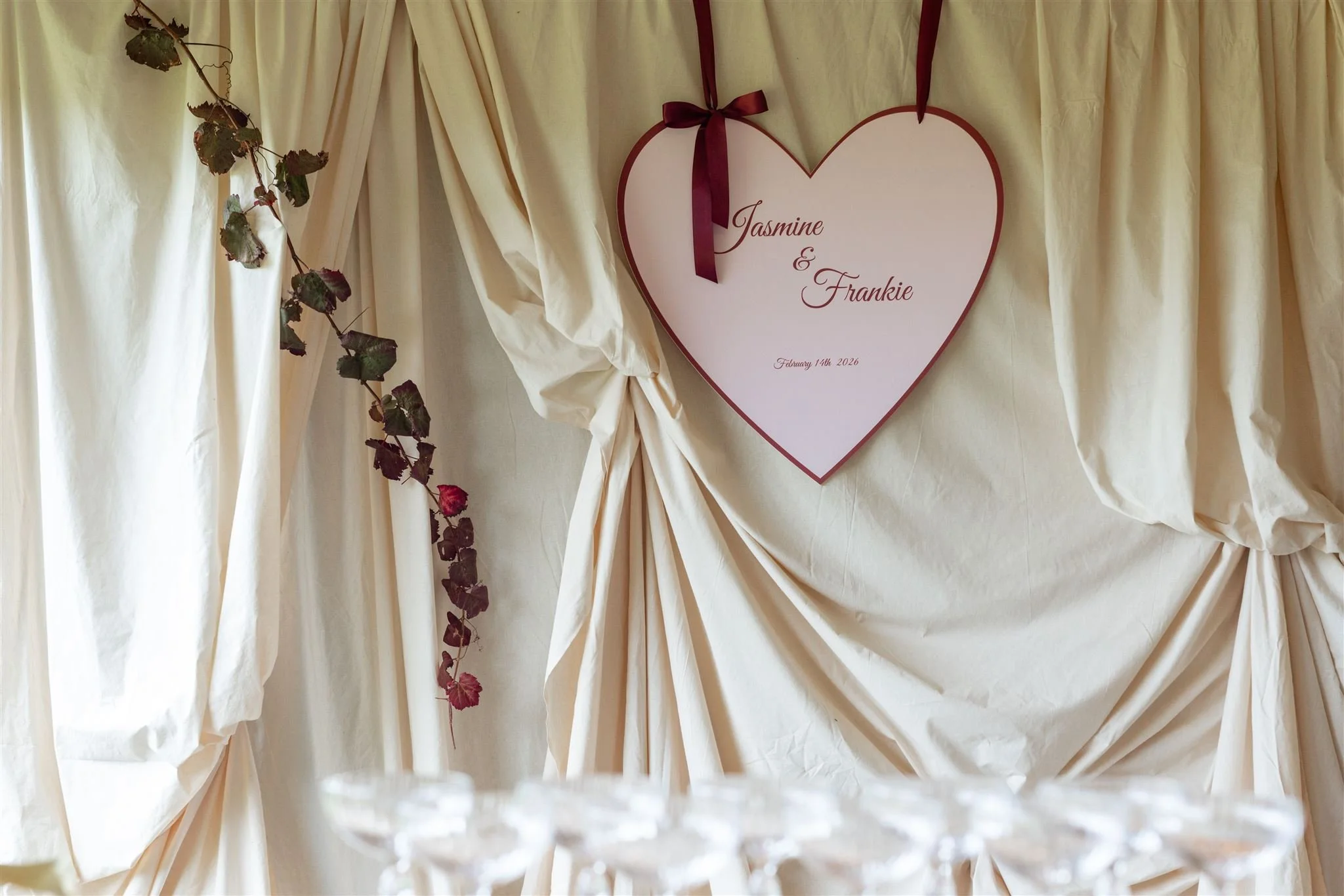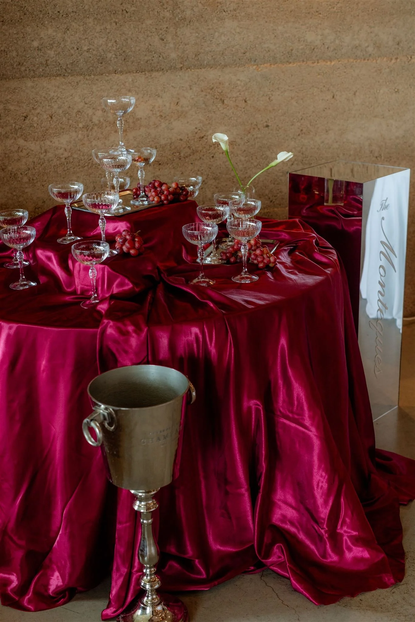 Our Valentine’s Day shoot at The Earth House reimagined classic romance through a lens of curated, monochromatic elegance, grounding soft cottagecore sensibilities with bold, modern accents. Against the venue's iconic rammed-earth backdrop, we layered crisp white linens and ethereal cream draping with striking pops of deep merlot and burgundy, creating a high-contrast aesthetic that feels both timeless and editorial. From the soft glow of pleated brass lamps and tall hurricane candles to the decadent, "still life" styling of the champagne tower, we love this look!